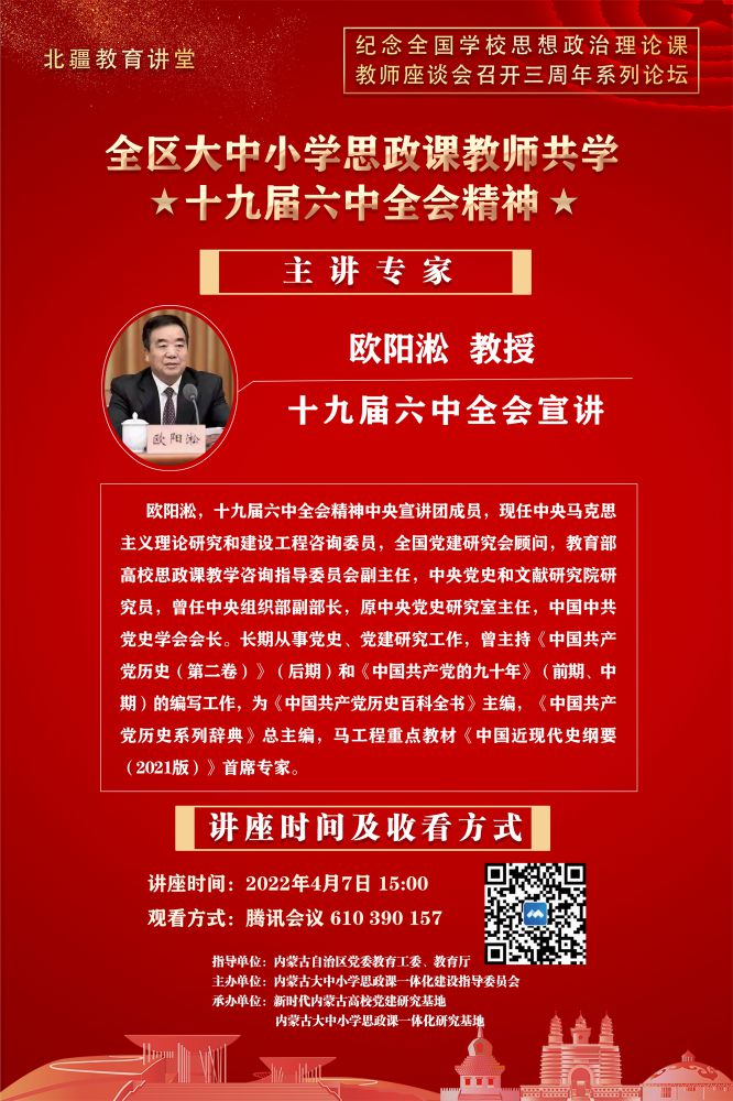 本次講座自治區教育廳邀請了黨的十九屆六中全會精神中央宣講團成員、中央馬克思主義理論研究和建設工程咨詢委員、全國黨建研究會顧問、教育部高校思政課教學咨詢指導委員會副主任、中央黨史和文獻研究院研究員歐陽淞作專題講座。講座緊緊圍繞學習領會習近平總書記在十九屆六中全會上的重要講話和《決議》精神,從深刻把握召開黨的十九屆六中全會、作出新的歷史《決議》的重大意義;深刻把握黨的百年奮斗的初心使命和重大成就;深刻把握中國特色社會主義新時代的歷史性成就和歷史性變革;深刻把握黨的百年奮斗的歷史意義和歷史經驗、走好新的趕考之路等方面,運用豐富史料與詳實數據,進行了系統闡述和深入解讀。